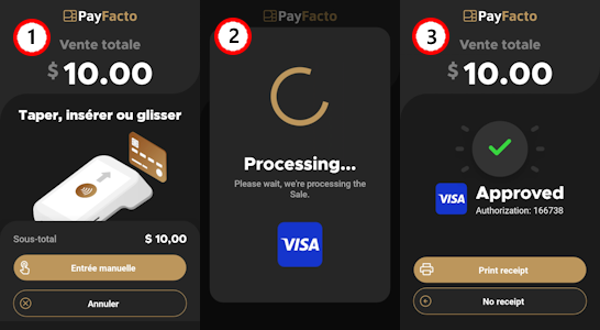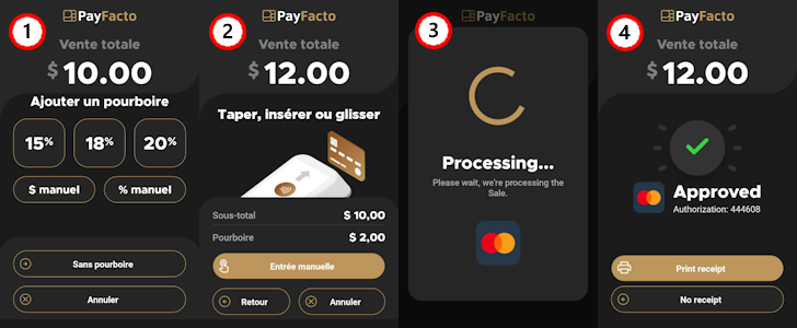 Une fois que le marchand a saisi le montant sur l'application tierce, le module App to app de Secure Payment affiche le montant total de la vente, à ce moment-là le marchand remet le terminal au client (ou le tourne vers lui). Si la vente comprend un pourboire, le terminal affiche l'écran Ajouter un pourboire, où le client sélectionne le pourboire à ajouter (ou non) avant d'insérer sa carte dans le lecteur de puce du terminal.