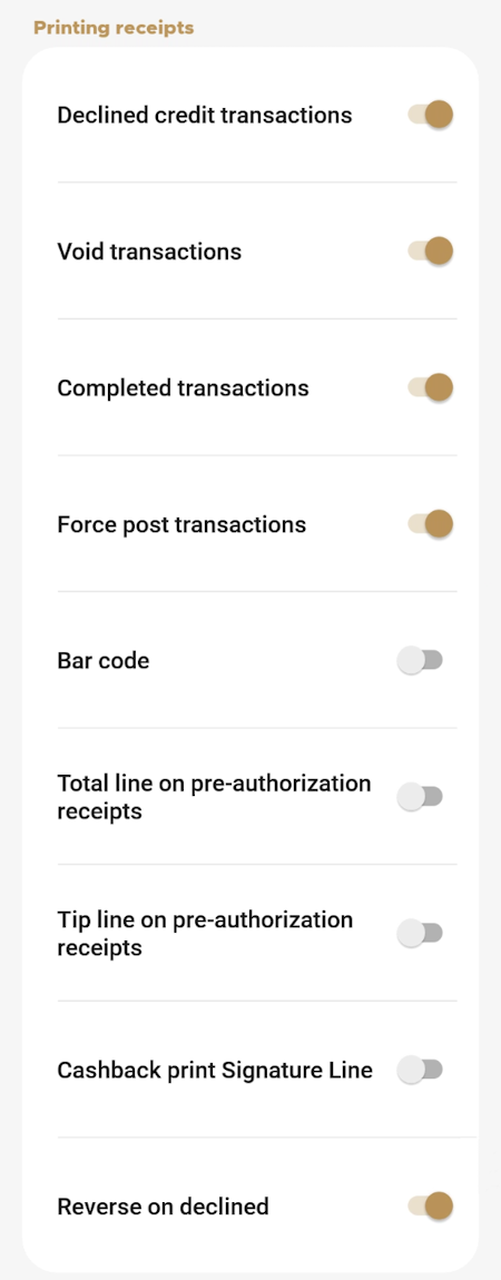 Défilez jusqu'à la section Reçu imprimé et basculez les différentes options vers la droite pour activer ou vers la gauche pour désactiver.