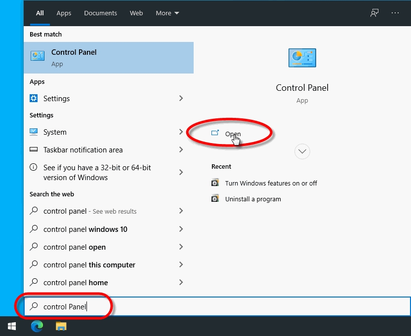 L'application Panneau de configuration devrait apparaître comme résultat de recherche. Cliquez sur Ouvrir.