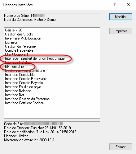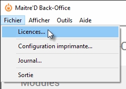 Assurez-vous que les options Interface Transfert de fonds électronique et EFT enrichie sont incluses avec votre licence Maitre'D. Pour le confirmer, connectez-vous simplement au Back-Office de Maitre'D en utilisant les identifiants appropriés, cliquez sur le menu Fichier et sélectionnez l'option Licences...