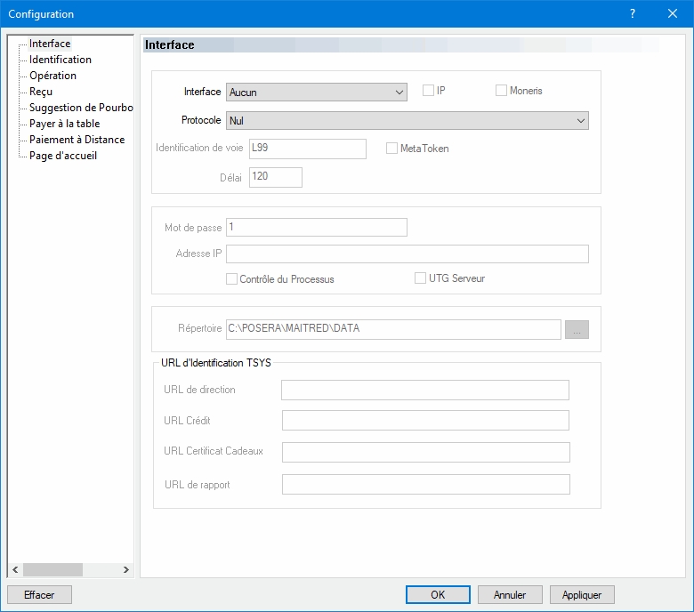 Les paramètres des branches Interface, Identification, Opération, Reçu, Suggestion de pourboire, Paiement à distance et Page d'accueil n'ont aucun effet sur le fonctionnement de SecureTable. Veuillez vous assurer de ne pas modifier ou supprimer les paramètres de ces pages, car ils pourraient affecter le fonctionnement des terminaux de paiement déjà en place.