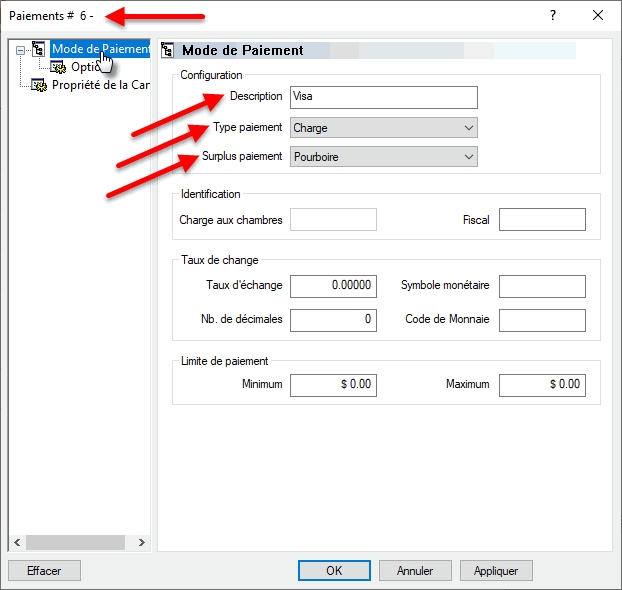 Une fenêtre Type de paiement vierge s'ouvrira directement à la branche Mode de paiement. Configurez selon les informations ci-dessous :