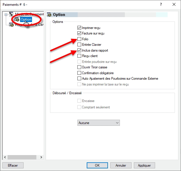 REMARQUE: Les options Imprimer reçu, Facture sur reçu et Ouvrir tiroir caisse n'ont aucun effet sur les terminaux de paiement avec SecureTable, mais tout terminal connecté à la caisse utilisant ce mode de paiement sera affecté.