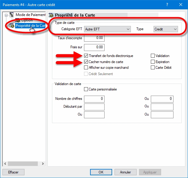 Désactiver cette option. Cette option s'active automatiquement lorsque le transfert de fonds électronique est activé. Vous devez donc vous assurer de bien la DÉSACTIVER. Sinon, la caisse demandera la date d'expiration de la carte de crédit, ce qui ralentira vos opérations. Ces informations sont déjà vérifiées par le terminal de paiement et n'ont pas besoin d'être revalidées par la caisse.