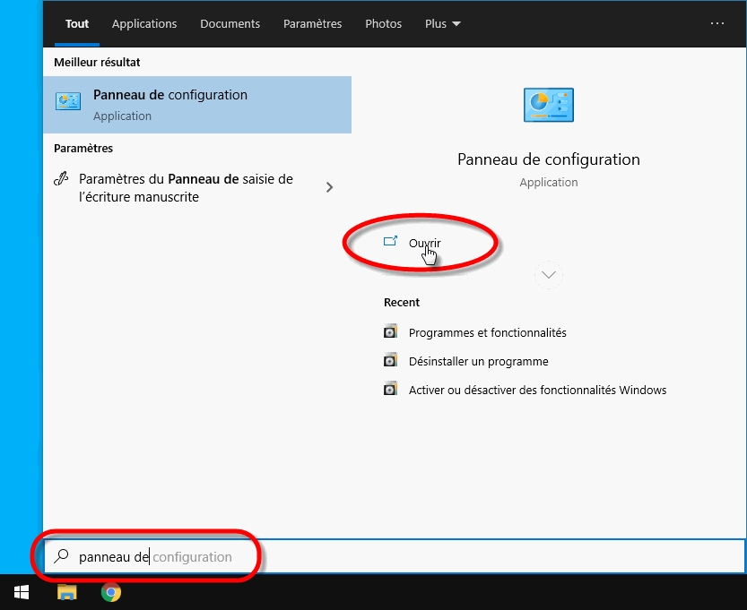 L'application Panneau de configuration devrait apparaître comme résultat de recherche. Cliquez sur Ouvrir.