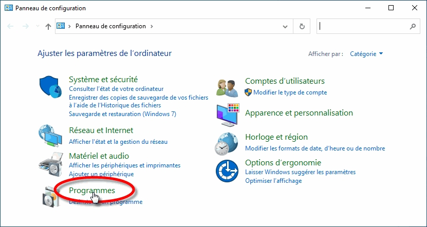 Dans l'application Panneau de configuration, cliquez sur Programmes.
