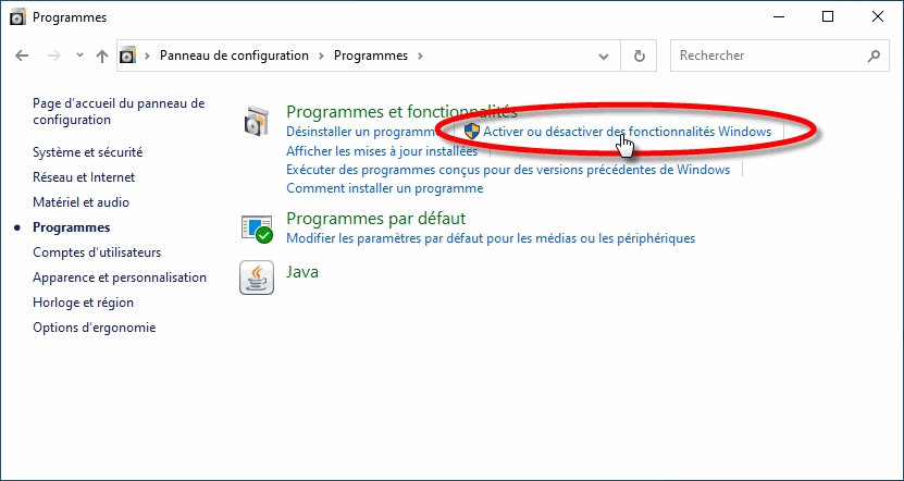 Sous Programmes et fonctionnalités, sélectionnez Activer ou désactiver des fonctionnalités Windows.