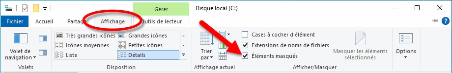 Assurez-vous que les fichiers et dossiers cachés sont visibles :