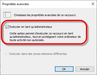 Configurer le raccourci à exécuter avec les privilèges administratifs