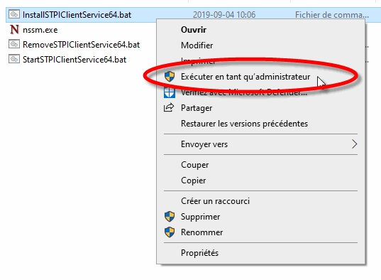 Localisez le fichier appelé StartSTPIClientService64.bat (pour Windows 64 bits) ou StartSTPIClientService32.bat (pour Windows 32 bits). Cliquez avec le bouton droit sur le fichier et sélectionnez l'option Exécuter en tant qu'administrateur.