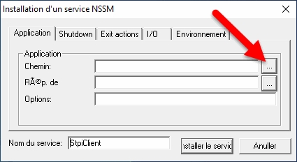 La fenêtre Installation d'un service NSSM s'ouvrira. Cliquez sur le bouton Parcourir (3 points) à côté du chemin d'accès (Path) :