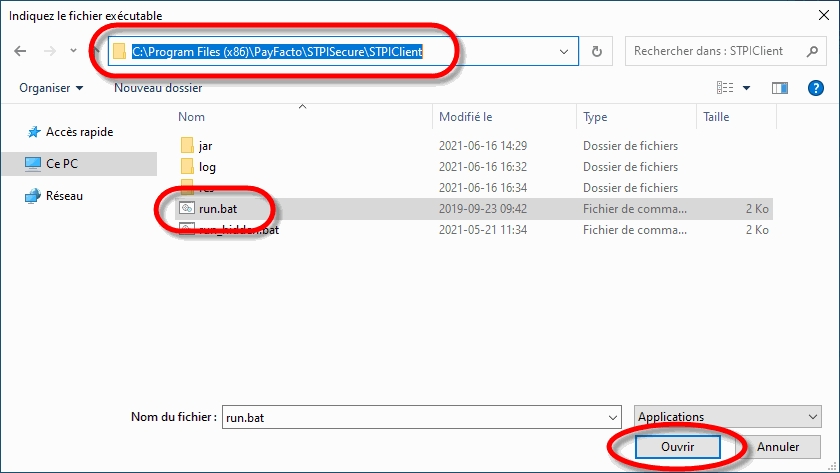 Sélectionnez le fichier Run.bat et cliquez sur Ouvrir.