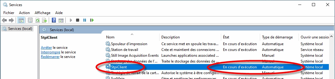 Une fois le PC redémarré, assurez-vous que le service STPIClient est en cours d'exécution en examinant les services Windows comme décrit ci-dessus.