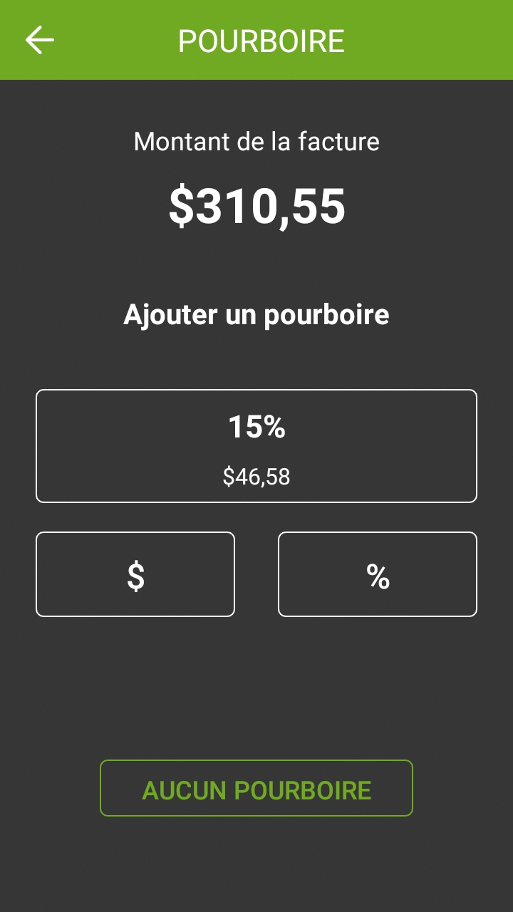 Lorsque l'écran de calcul du pourboire apparaît, le terminal de paiement doit être remis au client. Le client dispose des options suivantes: