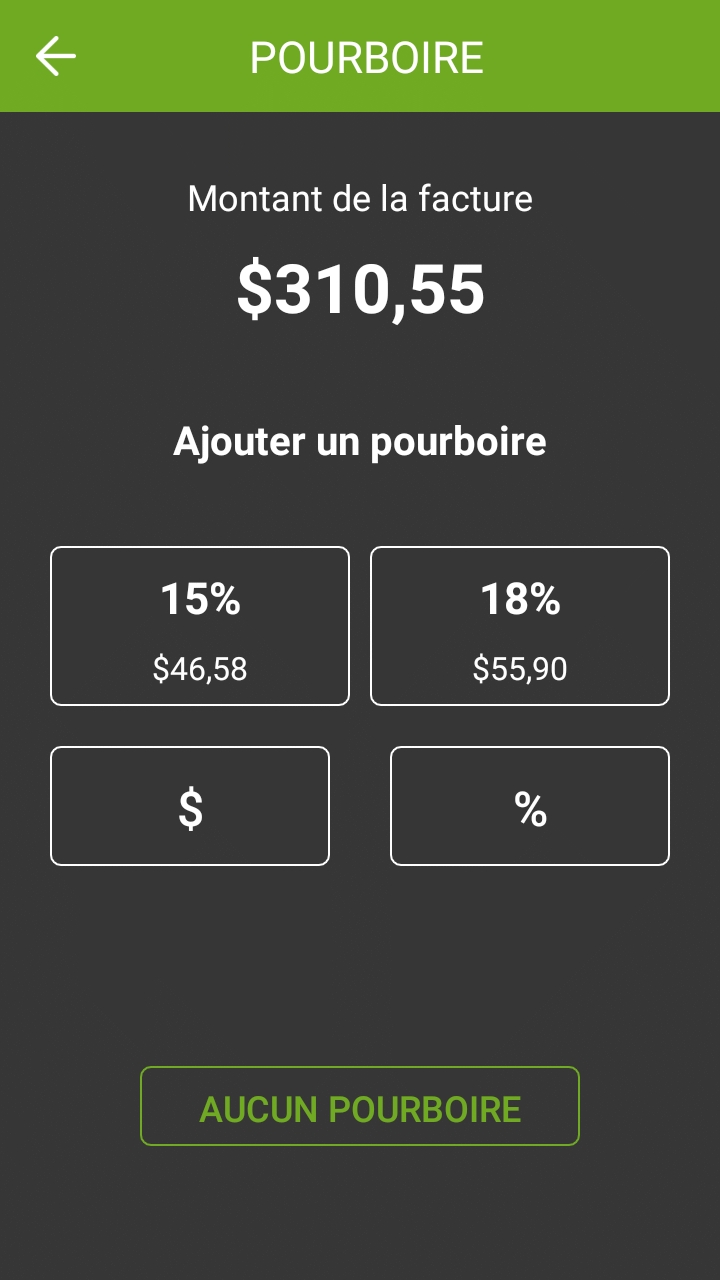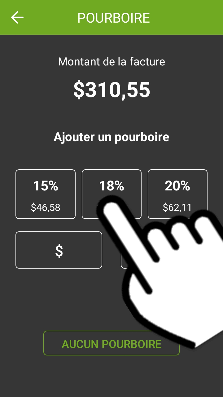 Toucher un préréglage ajoute automatiquement le montant du pourboire indiqué à l'addition.
