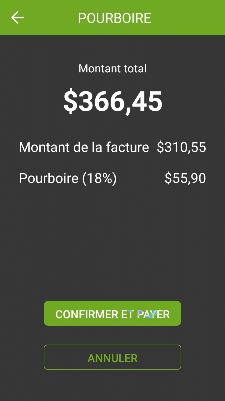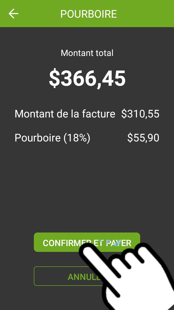 Après avoir touché le bouton CONFIRMER, l'écran de confirmation de pourboire s'affiche. Il s'agit de la dernière confirmation avant le paiement.