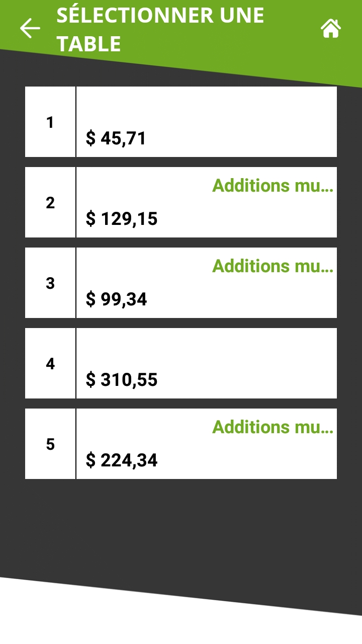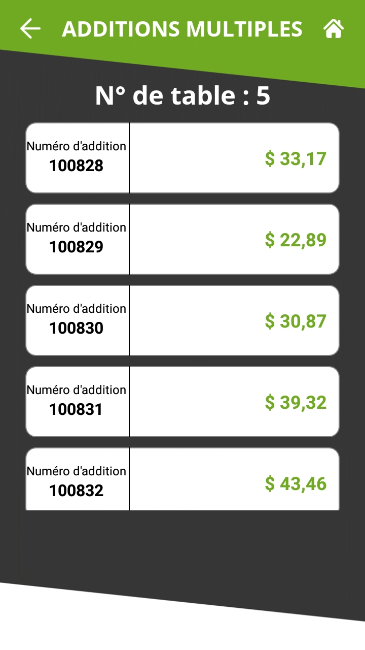 Lorsqu'une table contenant plusieurs additions imprimées est sélectionnée, la liste des additions disponibles s'affiche. Sur un écran de terminal de paiement typique, jusqu'à 5 additions peuvent être affichées à la fois. S'il y a plus de 5 additions, la liste peut être parcourue en balayant l'écran de haut en bas.