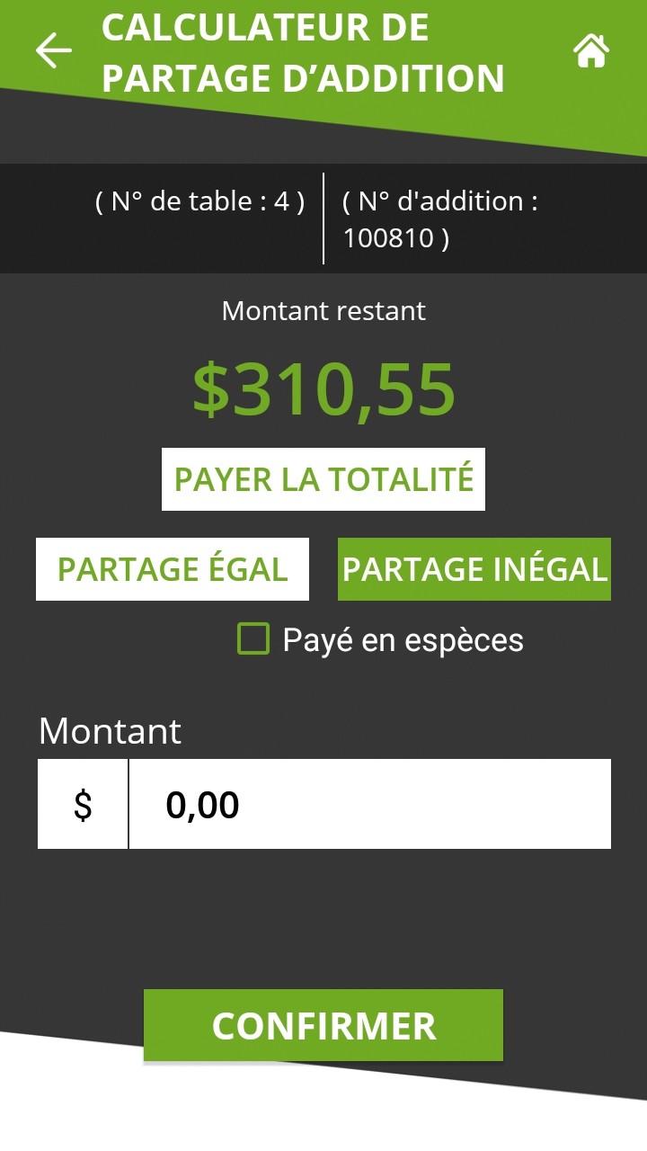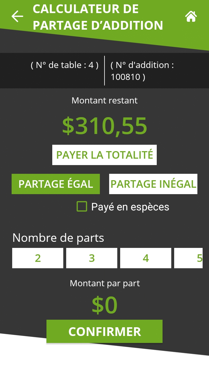 Le calculateur de partage est l'étape où le serveur discute avec le client de la façon dont l'addition sera payée. Les éléments suivants doivent être déterminés :