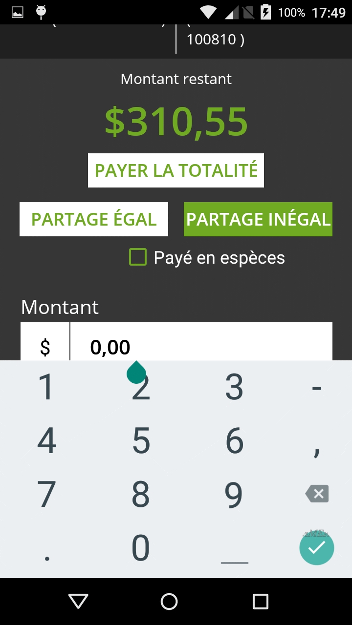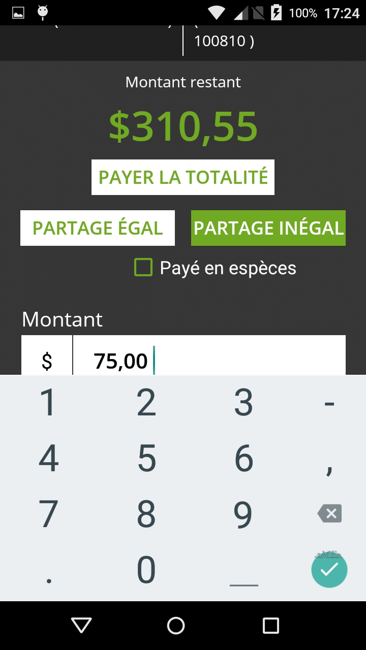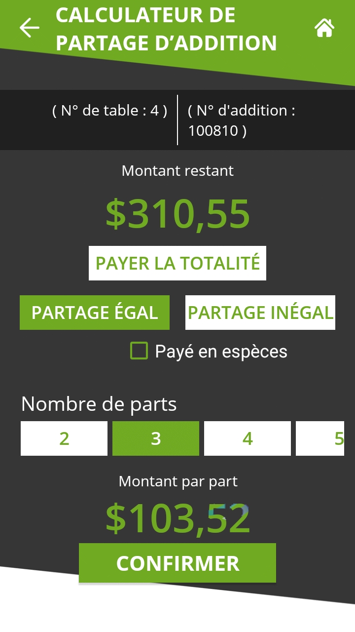 REMARQUE: Si le montant n'est pas divisible par le nombre de parts sans reste, il y aura un écart de $0.01 entre les parts. Dans l'exemple ci-dessus, pour un total de $310.55 divisé en 3 parts, les deux premières parts seront de $103.52 et la dernière part sera de $103.51