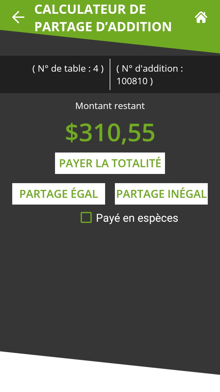 Touchez ce bouton pour payer l'addition en entier.