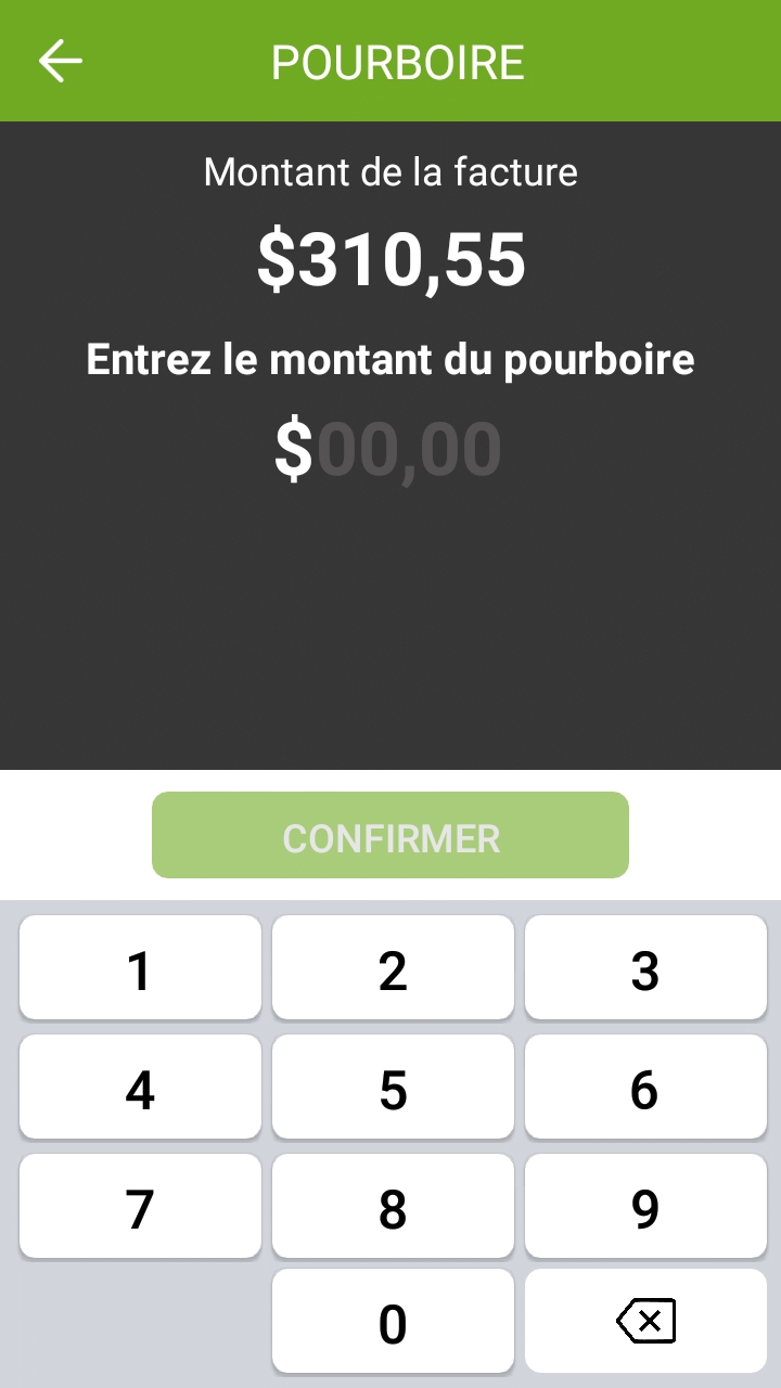 Le client utilise le clavier fourni pour entrer un montant de pourboire, ce qui rendra le bouton CONFIRMER disponible.