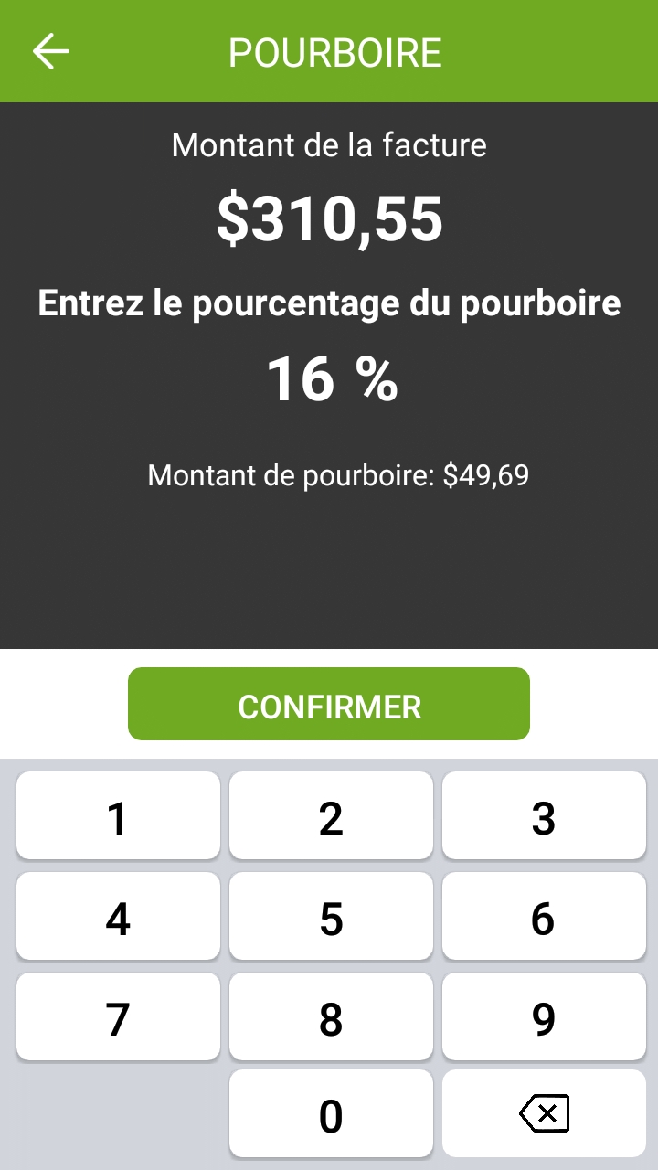 Le client utilise le clavier fourni pour entrer un pourcentage de pourboire, ce qui rendra le bouton CONFIRMER disponible.