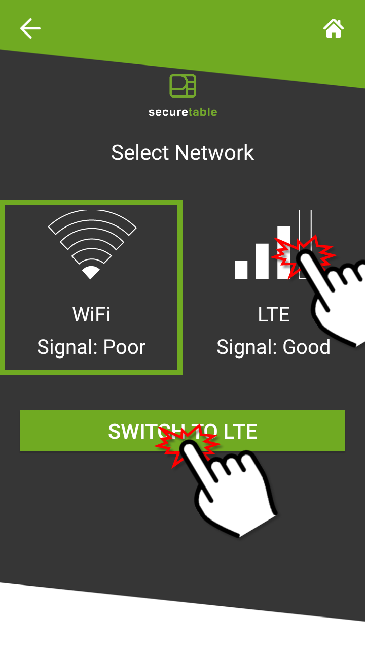 IMPORTANT! Après avoir basculé manuellement vers LTE, SecureTable n'essaiera pas de revenir au Wifi par lui-même. Si vous souhaitez utiliser à nouveau le Wifi, vous devrez passer manuellement au Wifi.