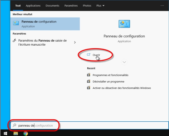 L'application Panneau de configuration devrait apparaître comme résultat de recherche. Cliquez sur Ouvrir
