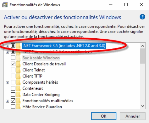 Activation de Microsoft .NET Framework 3.5 SP1 pour Windows 10