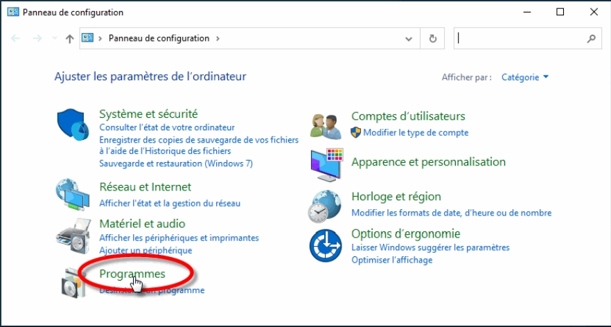 Dans l'application Panneau de configuration, cliquez sur Programmes.