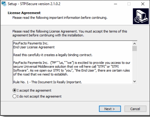 Ce composant installe le plugin RTI-SIPA, nécessaire à une utilisation avec l'application SecurePay pour les terminaux de paiement fixes. Ce composant doit être installé sur le serveur Back-Office principal du système de point de vente, de même que sur chacune des caisses où un terminal de paiement est installé. Ce plugin peut être installé conjointement au client STPISecure, pour les systèmes utilisant également des terminaux mobiles avec SecureTable.