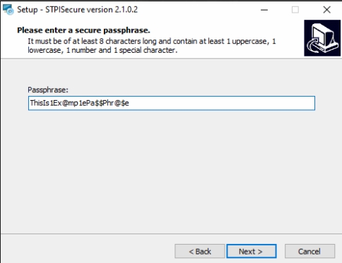 1. Si vous avez sélectionné l'option Tyro (Le client STPI aura Tyro activé), une phrase secrète sera demandée. Créez votre propre phrase secrète à ce stade et assurez-vous de vous en souvenir, ou notez-la et stockez-la dans un endroit sûr.