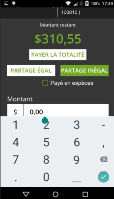 Après avoir touché le bouton PARTAGE INÉGAL, touchez le champ Montant, ce qui fera apparaître un clavier numérique. Entrez le montant que le client souhaite payer.