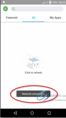 Si l'APN n'est pas configuré correctement ou s'il y a un problème avec la connectivité Internet via le réseau mobile, vous verrez un message disant"Réseau indisponible" brièvement affiché à l'écran. Au lieu de la liste des applications, vous verrez le message "Cliquez pour rafraîchir" et une icône de boîte vide.