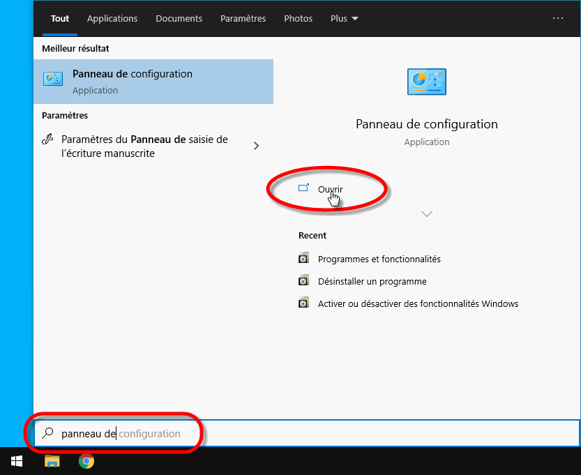 L'application Panneau de configuration devrait apparaître comme résultat de recherche. Cliquez sur Ouvrir.