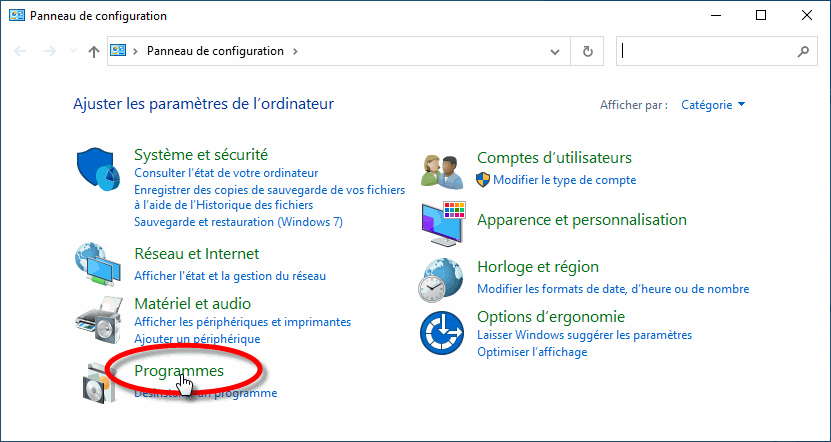 Dans l'application Panneau de configuration, cliquez sur Programmes.