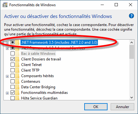 Activation de Microsoft .NET Framework 3.5 SP1 pour Windows 10