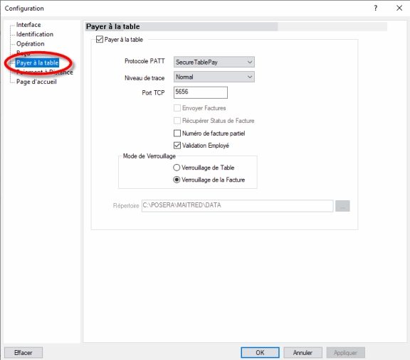Payer à la table Activez cette option pour activer la fonctionnalité de paiement à la Table (PATT).