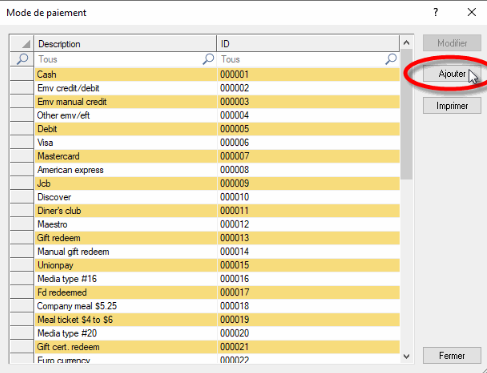 La liste de tous les types de paiements s'affiche. Cliquez le bouton Ajouter