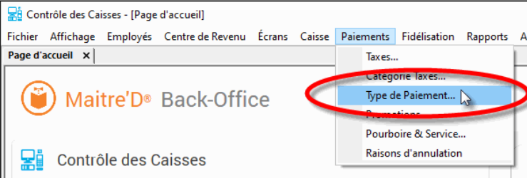 Cliquez sur le menu Paiements et sélectionnez l'option Type de paiement…