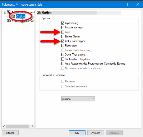 REMARQUE: Les options Imprimer reçu, Facture sur reçu et Ouvrir tiroir caisse n'ont aucun effet sur les terminaux de paiement avec SecureTable, mais tout terminal connecté à la caisse utilisant ce mode de paiement sera affecté.