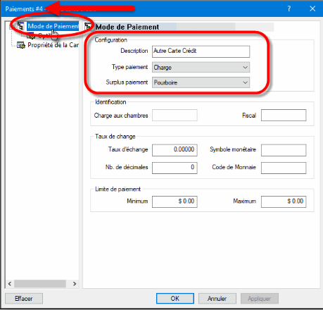 Une fenêtre Mode de paiement vierge s'ouvrira directement à la branche Mode de paiement. Configurez selon les informations ci-dessous