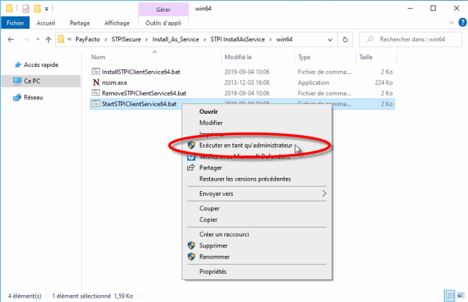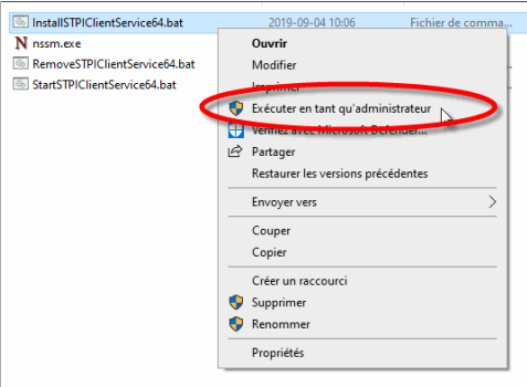 Localisez le fichier appelé StartSTPIClientService64.bat (pour Windows 64 bits) ou StartSTPIClientService32.bat (pour Windows 32 bits). Cliquez avec le bouton droit sur le fichier et sélectionnez l'option Exécuter en tant qu'administrateur.