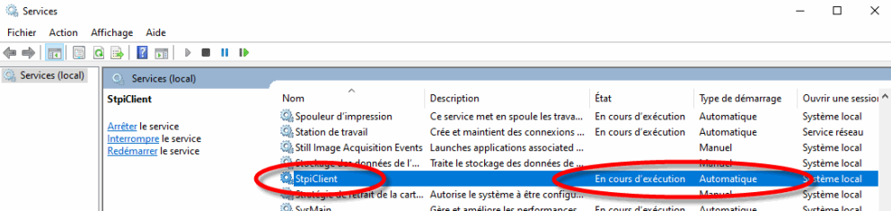 Dans la liste des services, recherchez StpiClient. L'état du service doit être En cours d'exécution et le type de démarrage doit être Automatique.