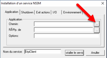La fenêtre Installation d'un service NSSM s'ouvrira. Cliquez sur le bouton Parcourir (3 points) à côté du chemin d'accès (Path) :