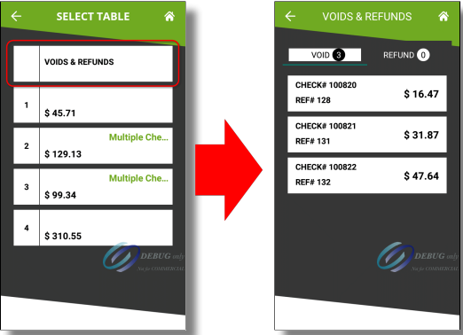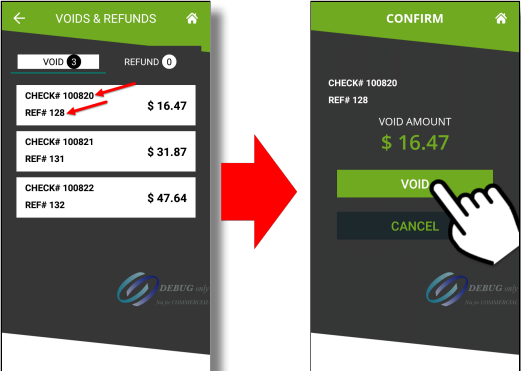 5. Localisez la case qui représente la transaction que vous souhaitez annuler et touchez-la. Si plusieurs annulations en attente sont répertoriées, utilisez le numéro de facture (d'addition) ou le numéro de référence pour localiser celle que vous souhaitez traiter. Appuyez sur le bouton VOID pour lancer le processus.