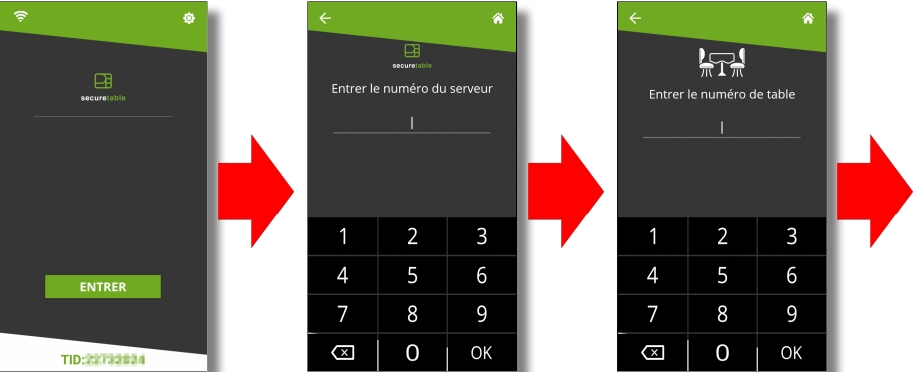Connectez-vous à SecureTable avec votre numéro d'employé. Il n'est pas nécessaire d'entrer un numéro de table ou d'addition, alors appuyez simplement sur OK sans rien entrer si ces écrans sont affichés.