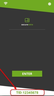Localisez le terminal de paiement avec l'identifiant de terminal (TID) approprié. Sur l'application SecureTable, l'identifiant du terminal (TID) s'affiche en vert en bas de l'écran d'accueil et se compose de 8 chiffres