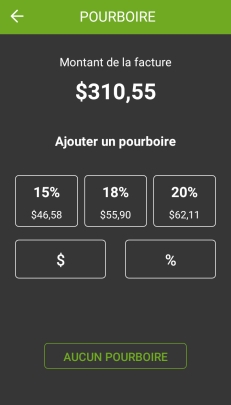 Si l'option Pourboire est dactivée dans la configuration de SecureTable, l'écran de calcul du pourboire sera affiché.