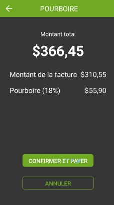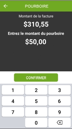 Après avoir touché le bouton CONFIRMER, l'écran de confirmation de pourboire s'affiche. Il s'agit de la dernière confirmation avant le paiement.